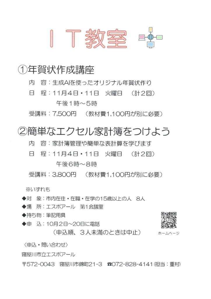 〈IT教室〉【年賀状作成講座】 11月4日・11日(火) 午後1時~5時 【簡単なエクセル家計簿をつけよう】 11月4日・11日(火) 午後6時~8時 投稿日 2025年9月25日 更新日 2025年10月1日 著者 寝屋川市立エスポアール カテゴリー イベント
