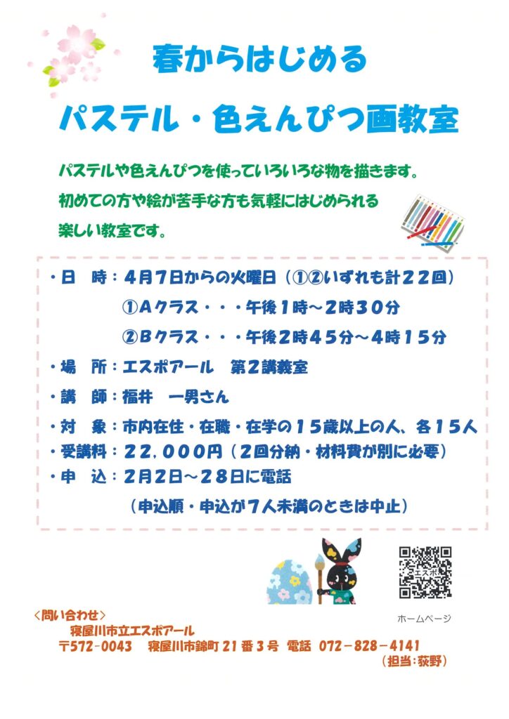 〈パステル・色えんぴつ画教室〉 4月7日からの火曜日 ①Aクラス 午後1時~2時30分 Ⓑクラス 午後2時45分~4時15分