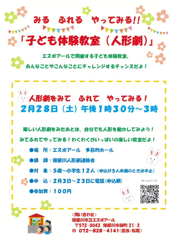 〈子ども体験教室〉【人形劇】~みる・ふれる・やってみる~ 2月28日(土) 午後1時~3時