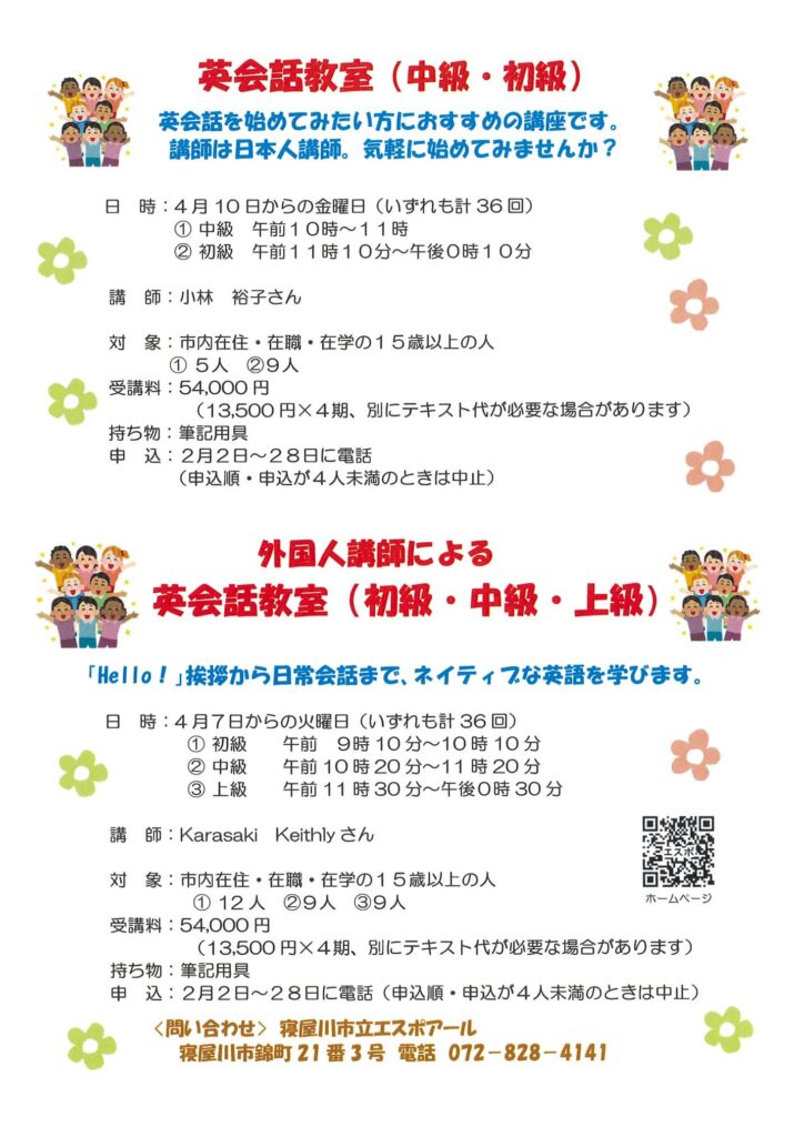 〈英会話教室〉【中級・初級クラス】 4月10日からの金曜日 【外国人講師クラス】 4月7日からの火曜日