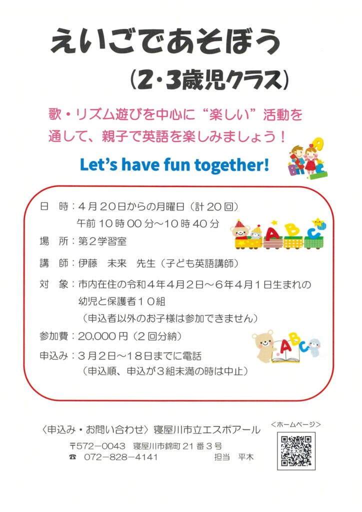 〈えいごであそぼう〉【2・3歳児英語クラス】 4月20日からの月曜日 午前10時~10時40分 投稿日 2026年2月24日 更新日 2026年2月25日 著者 寝屋川市立エスポアール カテゴリー イベント